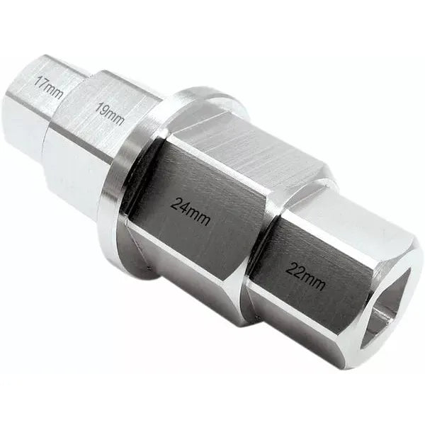 Superlight T-6 Hex Axle ToolUse wrench on external hex of tool for situations exceeding 90 lb/ft Fits internal hex on many late model sportbike axles and some dirt bikes 3/8" square drive on both ends rated to 90 lb/ft Weighs only 2.5 oz Made in the USA For touring and trailside use only. EU: use wrench on external hex of tool for situations exceeding 122,02 Nm EU 3/8" square drive on both ends rated to 122,02 Nm EU: Weighs only 70.87 grs